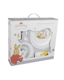 This 5 piece melamine dinner set comprises of a plate, bowl, spoon, sipper cup and bib and is part of the Bunnykins range designed for older babies/toddlers. The set comes in a lovely silver-coloured design theme - specifically on the spoon handle, bib trim, cup lid, plate and bowl rims - and also depict white running bunnies. The dinner set comes in an attractive box - making it a perfect. . .�24.00